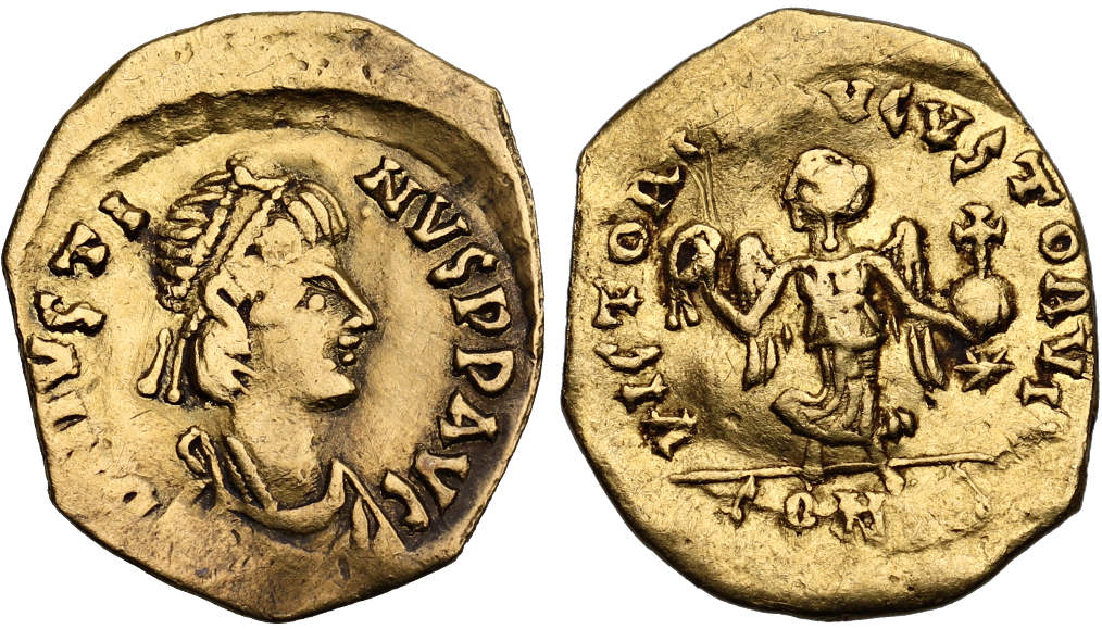 SOLD: Justinian Dynasty, Justin I, 518-527 AD, Gold, AV Tremissis, struck 518-527 AD