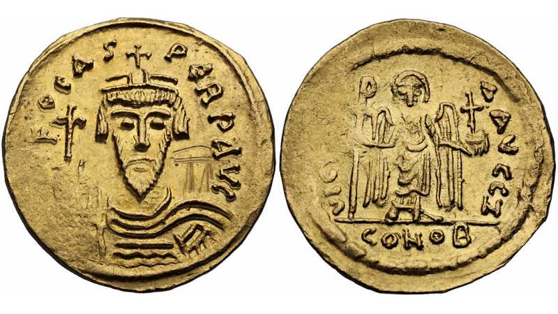 Obverse: ON FOCAS PERP AVG, Draped and cuirassed bust facing, wearing crown without pendilia and holding globus cruciger