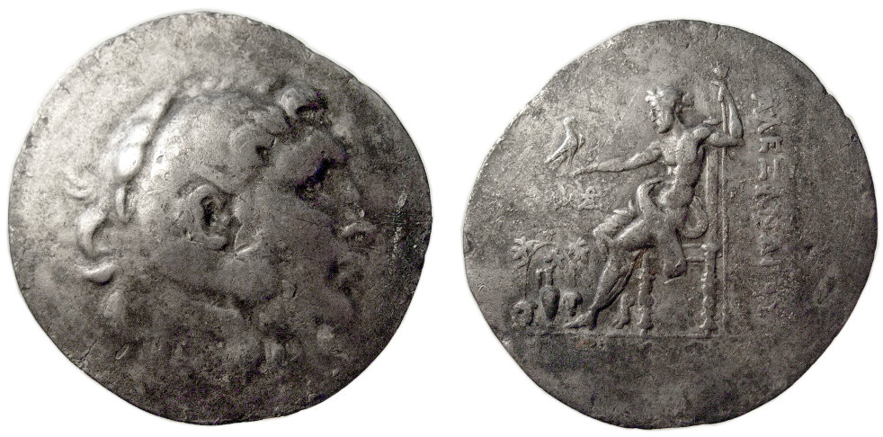 Reverse: ALEΞANDROU, Zeus seated left on throne, one leg drawn back, holding eagle and sceptre; two monograms in left field, oinochoe in oak wreath in lower left field