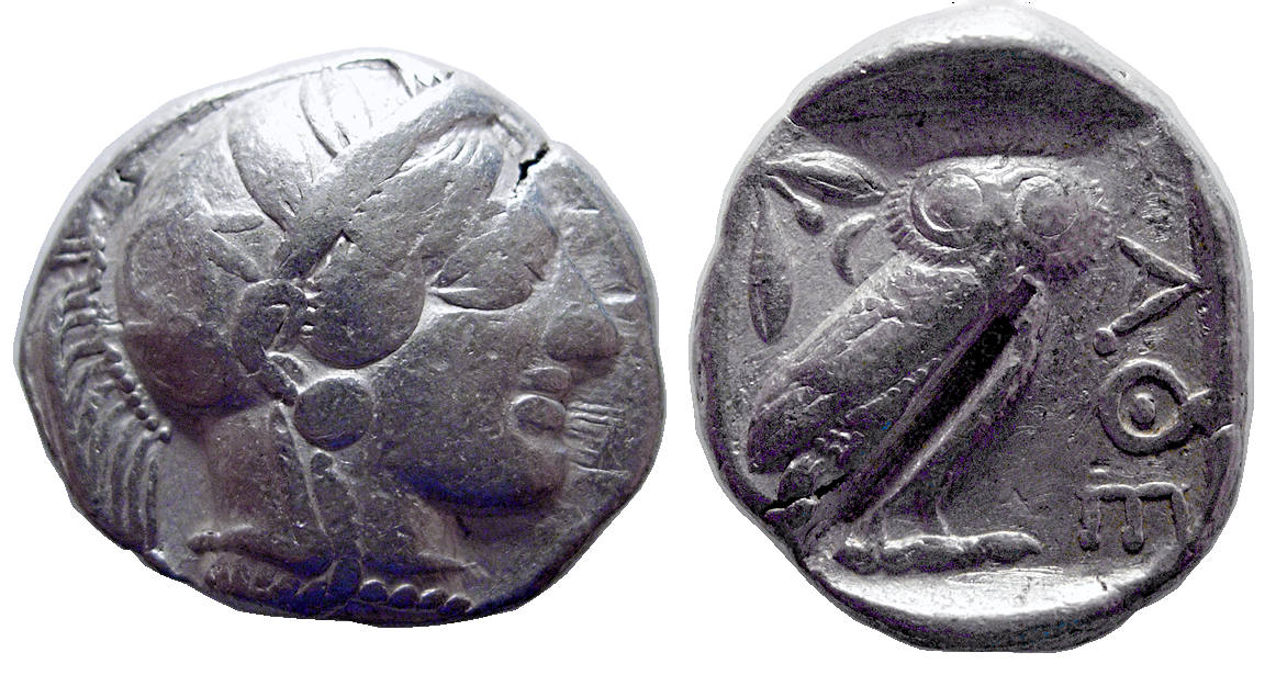 Reverse: Owl standing right head facing, in erect posture; the tail feathers represented as a single prong; to the right, AΘE, in large, even lettering; to left, olive-twig and crescent; all within incuse square