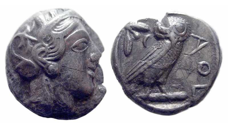 Reverse: Owl standing right head facing, in erect posture; the tail feathers represented as a single prong; to the right, AΘE, in large, even lettering; to left, olive-twig and crescent; all within incuse square