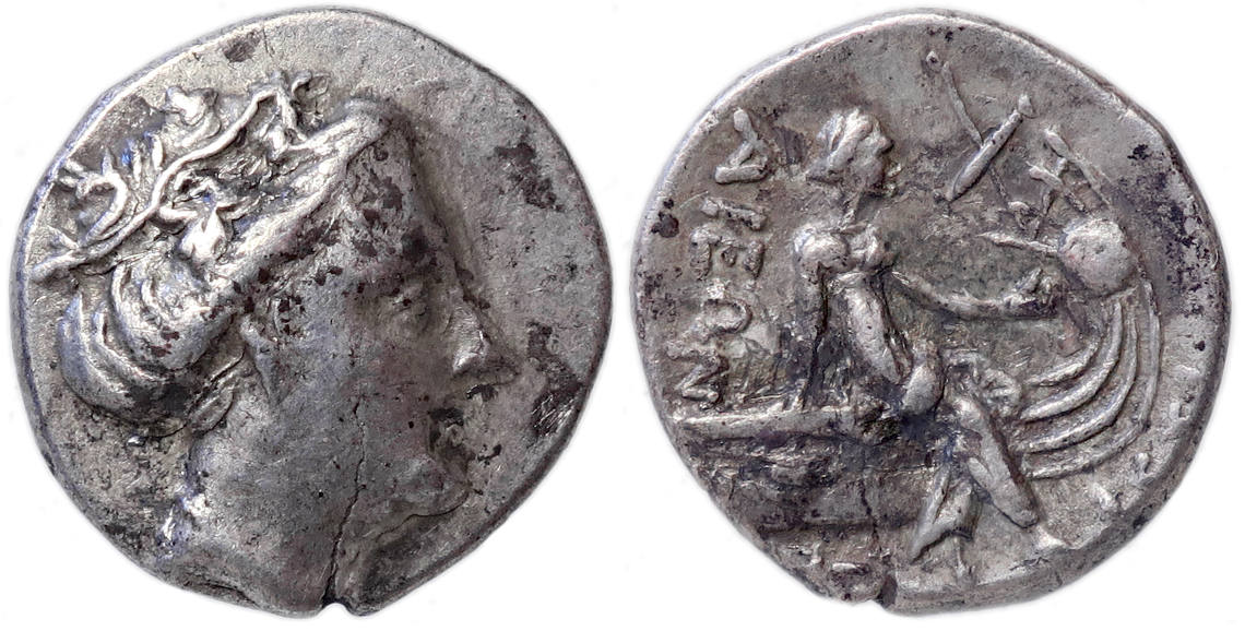 Reverse: [IΣTI] - AEIΩN, Nymph Histiaia seated right on stern of galley, ornamented with wing, holding naval standard; trident below