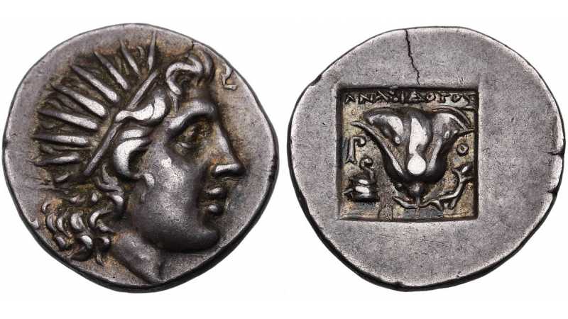 Reverse: ΑΝΑΞΙΔΟΤΟΣ, Rose with bud; stem to right; serpent entwined around omphalos to left; to left and right, P-O; all within shallo incuse square;