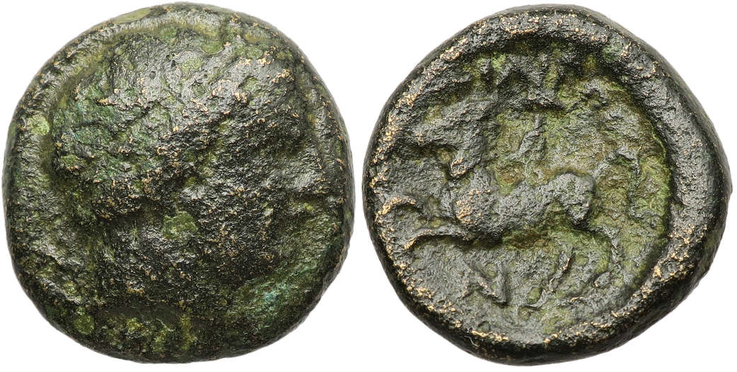 Philip II of Macedon was King of Macedon and father of Alexander the Great and Philip III Arrhidaeus. The bronze series of this type is extensive and differentiated principally by the different symbols and letters which appear on the reverse and occasionally on the obverse. These symbols and letters, known as control marks, were used to identify the officials responsible for a particular issue of coinage.