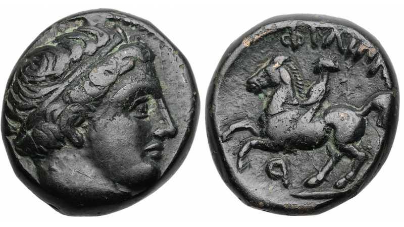 General: Philip II of Macedon was King of Macedon and father of Alexander the Great and Philip III Arrhidaeus. The bronze series of this type is extensive and differentiated principally by the different symbols and letters which appear on the reverse and occasionally on the obverse. These symbols and letters, known as control marks, were used to identify the officials responsible for a particular issue of coinage.