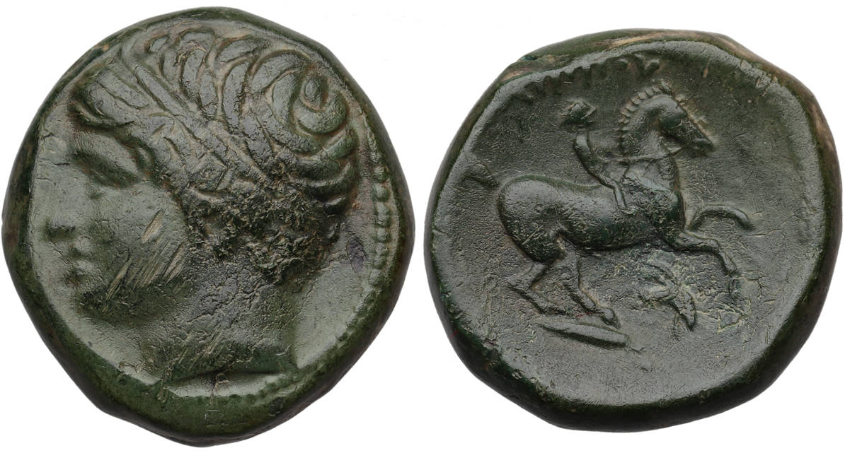Obverse: Young male head, hair bound with taenia, facing left