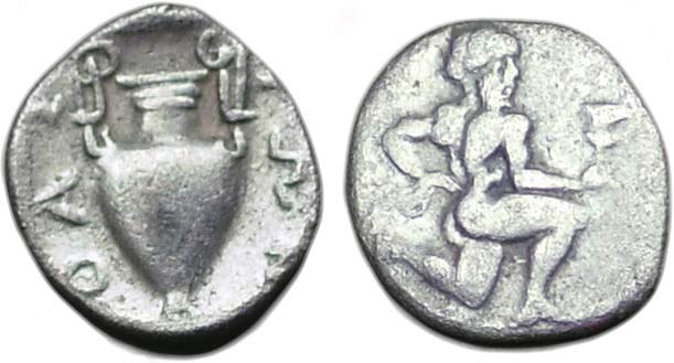 Obverse: Satyr kneeling right holding kantharos