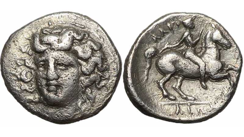 Reverse: ΛΑΡI-[Σ] / AΙΩΝ, Thessalian cavalryman riding right on prancing horse, wearing chlamys and petasos, raising right hand without a whip or goad
