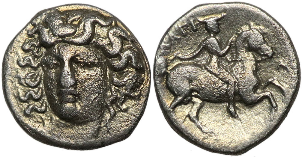 Reverse: ΛΑΡI-Σ / [AΙΩΝ], Thessalian cavalryman riding right on prancing horse, wearing chlamys and petasos, raising right hand without a whip or goad
