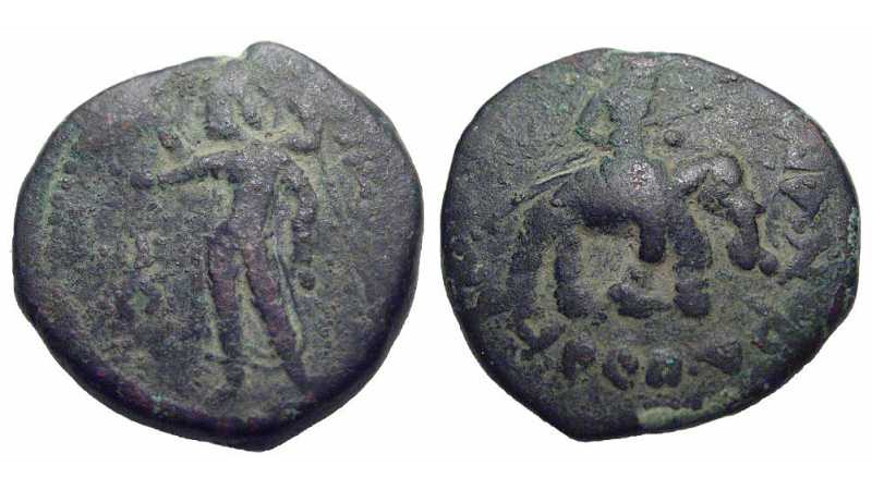 Obverse: þAONAOþPAO OOHþKE KOþANO ('King of Kings, Huvishka Kushan'), Elephant rider king holds a staff diagonally in right hand and carries an elephant goad horizontally over the elephant's back