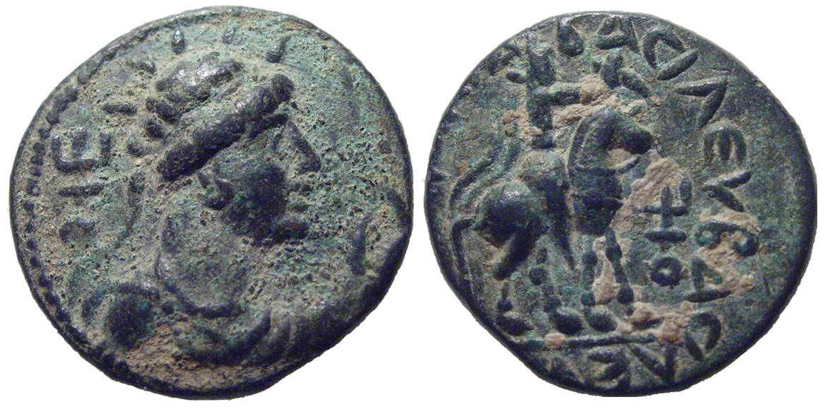 Reverse: ΒΑCΙΛΕΩ[C] ΒΑCΙΛE[ΥΩΝ CΩΤΗP ΜΕΓΑC] ('King of kings, great saviour'), King riding horse to right, wearing soft Iranian cap with long diadem ribbons, nomad jacket and trousers; holding pickaxe in raised right hand; three-pronged tamga to right
