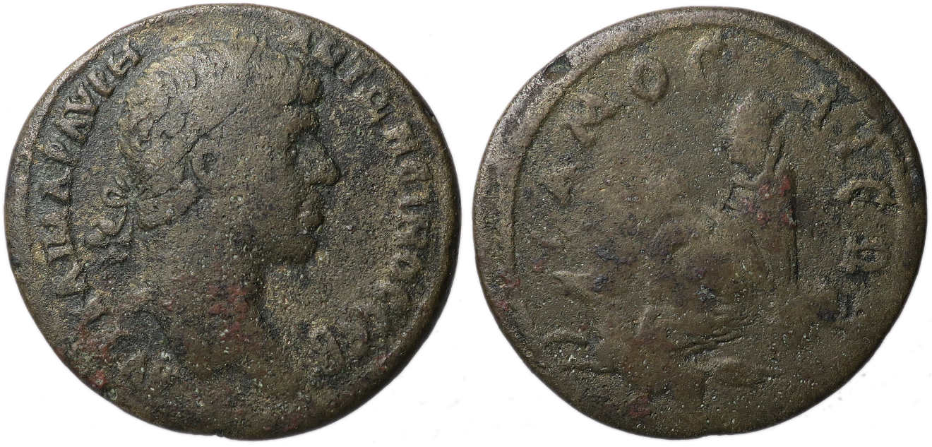 Obverse: AVT K M AV ANTΩNINOC C, laureate head of Elagabalus right