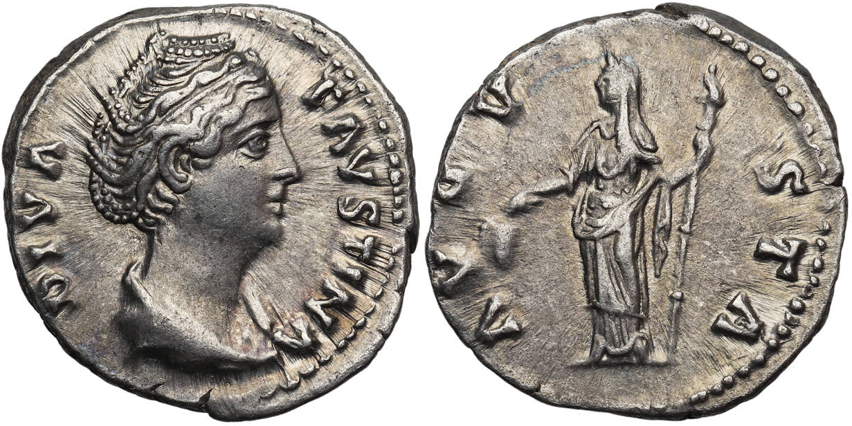 Obverse: DIVA FAVSTINA, Bust of Faustina I, draped, right, hair elaborately waved and coiled, with bands across the head, drawn up at the back and piled in a round coil on top