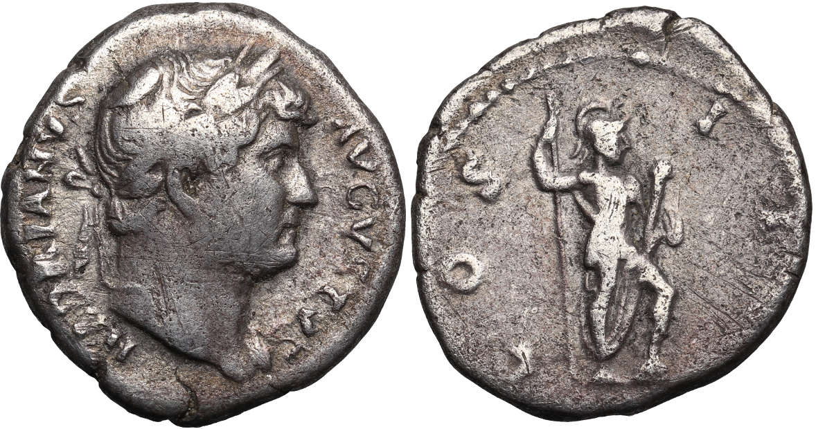 Obverse: HADRIANVS AVGVSTVS, Head of Hadrian, laureate, right, with drapery on left shoulder