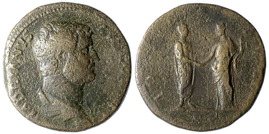 Reverse: FORTVNAE REDVCI S C, Hadrian standing right holding roll, clasping hands with Fortuna who holds cornucopia and rudder in left