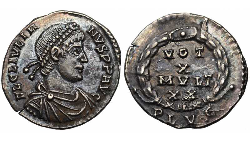 Description from original listing of coin: CNG is pleased to present a selection of coins from the East Harptree Hoard of 1887. This hoard was discovered near the village of East Harptree, located approximately 16 miles southwest of Bath. The hoard consisted of 1496 silver coins, five silver ingots, and a Roman silver ring set with a carnelian intaglio stone. The coins are 4th century, covering the period of Constantine the Great to Gratian (circa AD 306 to 383). The landowner, Mr. William Kettlewell, made the hoard available to the British Museum, and it was first written up by John Evans in The Numismatic Chronicle of 1888 (pp. 22-46). The British Museum kept 25 of the most interesting coins from the hoard, and the rest of hoard was returned to the owner.