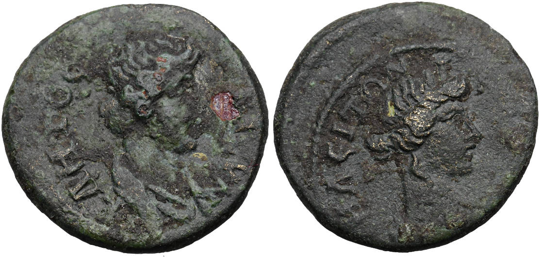 Reverse: [NAKP]A CIΤΩΝ, Turreted bust of city-goddess (or Roma), right, shoulders draped; border of dots