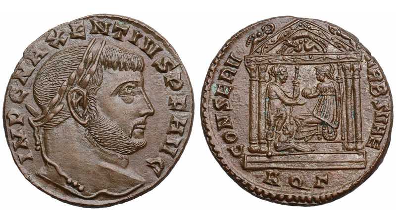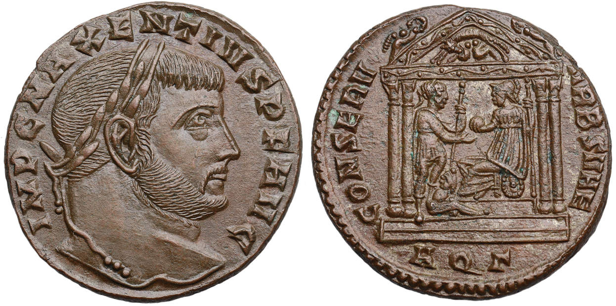 Obverse: IMP C MAXENTIVS P F AVG, Head of Maxentius, laureate, right