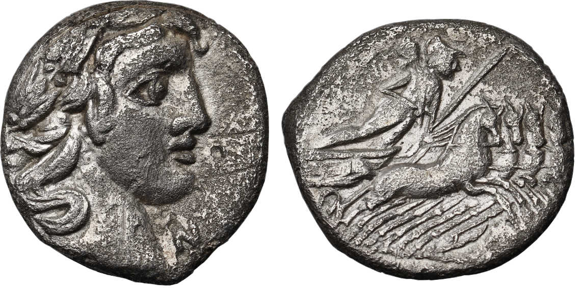 Reverse: [C . VIBIVS . C . F (in exergue)], Minerva in quadric right, horses galloping; she holds trophy in right hand and spear and reins in left