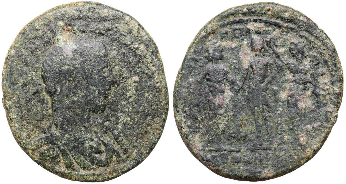 Reverse: [...ΠΙϹ ΘƐ ΑΛƐΞ ΝƐΩΚΟΡΟΥ ΑΙΓƐΩΝ..], Emperor standing facing, looking left, holding serpent-staff and patera over lighted altar, in front of Asclepius standing facing, looking right, resting on serpent-staff; to right, the City personification standing, left, crowning him with wreath from behind