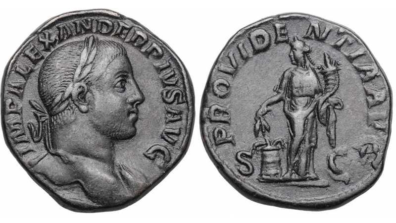 General: Severus Alexander was Roman Emperor from 222 to 235 AD. He was the last emperor of the Severan dynasty. His death marked the beginning of the Crisis of the Third Century, during which the Roman Empire would almost crumble. He was assassinated in 235 AD by mutinous soldiers paving the way for Maximus to become Roman Emperor. This coin was issued late into his reign by which stage he had developed a fully grown beard. Derived from the word 'providere' (to foresee), Providentia is the divine personification of foresight and making provision. Its use on coinage was to show that the emperor could foresee the needs of his empire and provide for his people.