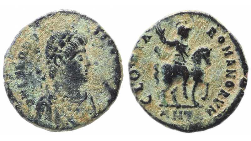 Reverse: GLORIA ROMANORVM, emperor on horseback, hand raised; mintmark ANTA in exergue