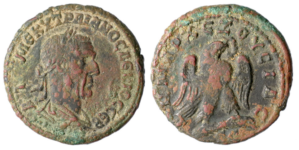 Reverse: ΔHMAΡX EΞOYCIAC, Eagle standing right on palm, holding wreath in beak; SC in exergue